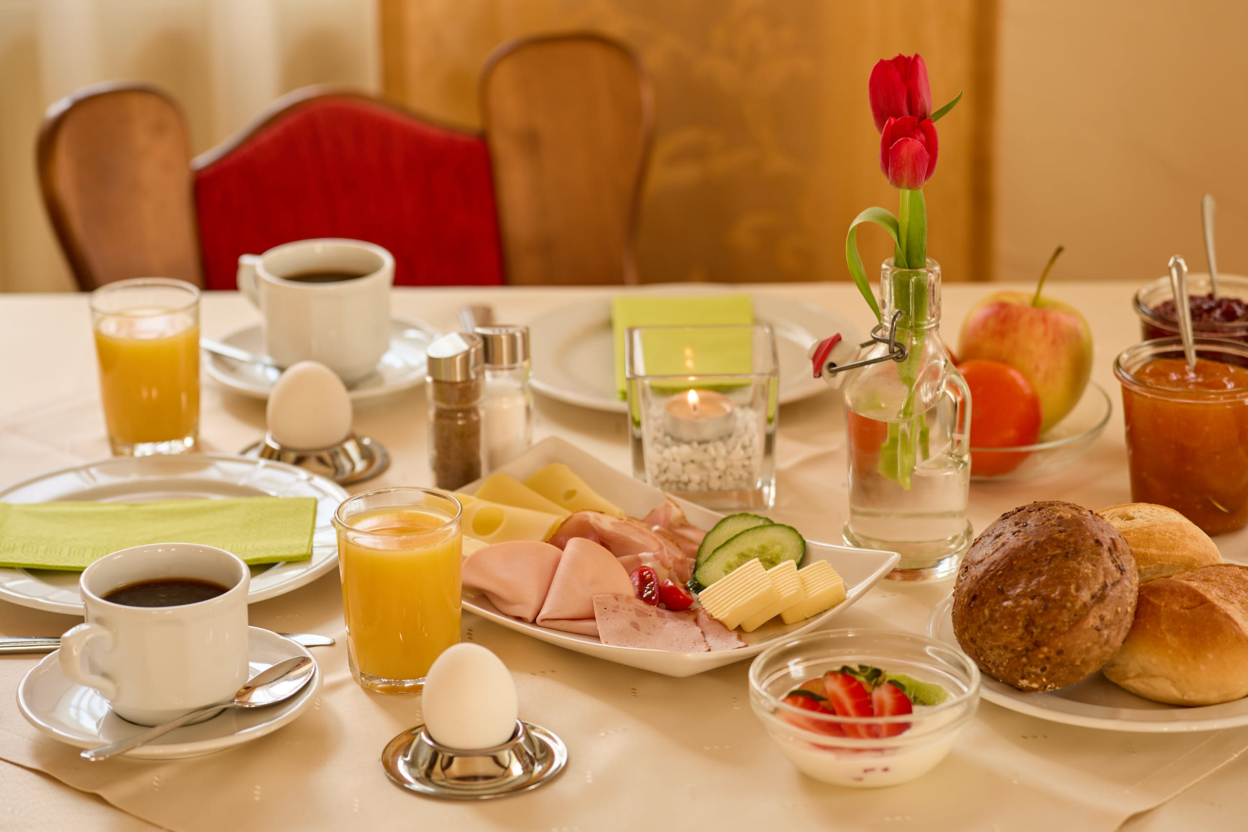 Genießen Sie täglich ein reichhaltiges Frühstücksbüffet für einen gelungenen Start in Ihren Urlaubstag mit Brötchen, Brot, Konfitüren, Aufstrichen, Wurst, Käse, Ei, Müsli, Obst, Saft, Kaffee und Tee. Das Frühstück ist im Zimmerpreis enthalten. Frühstückszeit täglich von 8:00 bis 9:30 Uhr.